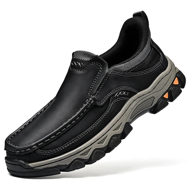 A rugged leather loafer designed for versatility and long-lasting comfort. Crafted from durable split leather with reinforced stitching and a treaded rubber outsole that provides reliable traction and flexibility. The easy slip-on construction keeps the silhouette refined while built to handle everyday wear.